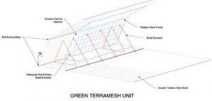 The project team reinforced the 112-foot-high slope with the Green Terramesh system. The system’s angled front face and erosion control blanket are designed to help establish natural vegetation .