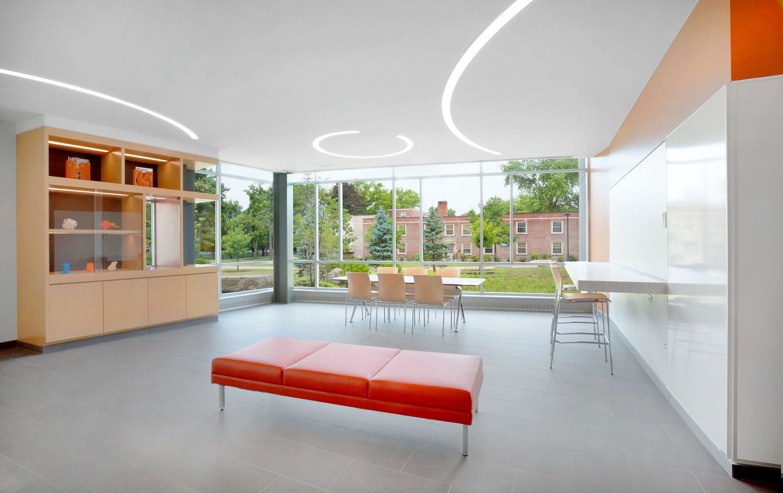 “The bright, open, 661-square foot entrance lobby is intended as a collaborative space for students. It features cabinets that display 3D-printed artifacts. Counters with computer charging and data outlets, lounge-style seating, and whiteboards that allow students to study, work, and collaborate. The lobby also features a textured art wall invoking 3D-printed panels. The flooring consists of textured porcelain ceramic tile and the ceiling is gypsum board. The space features ring-like curvilinear LED ceiling light fixtures,” explains Lapp.