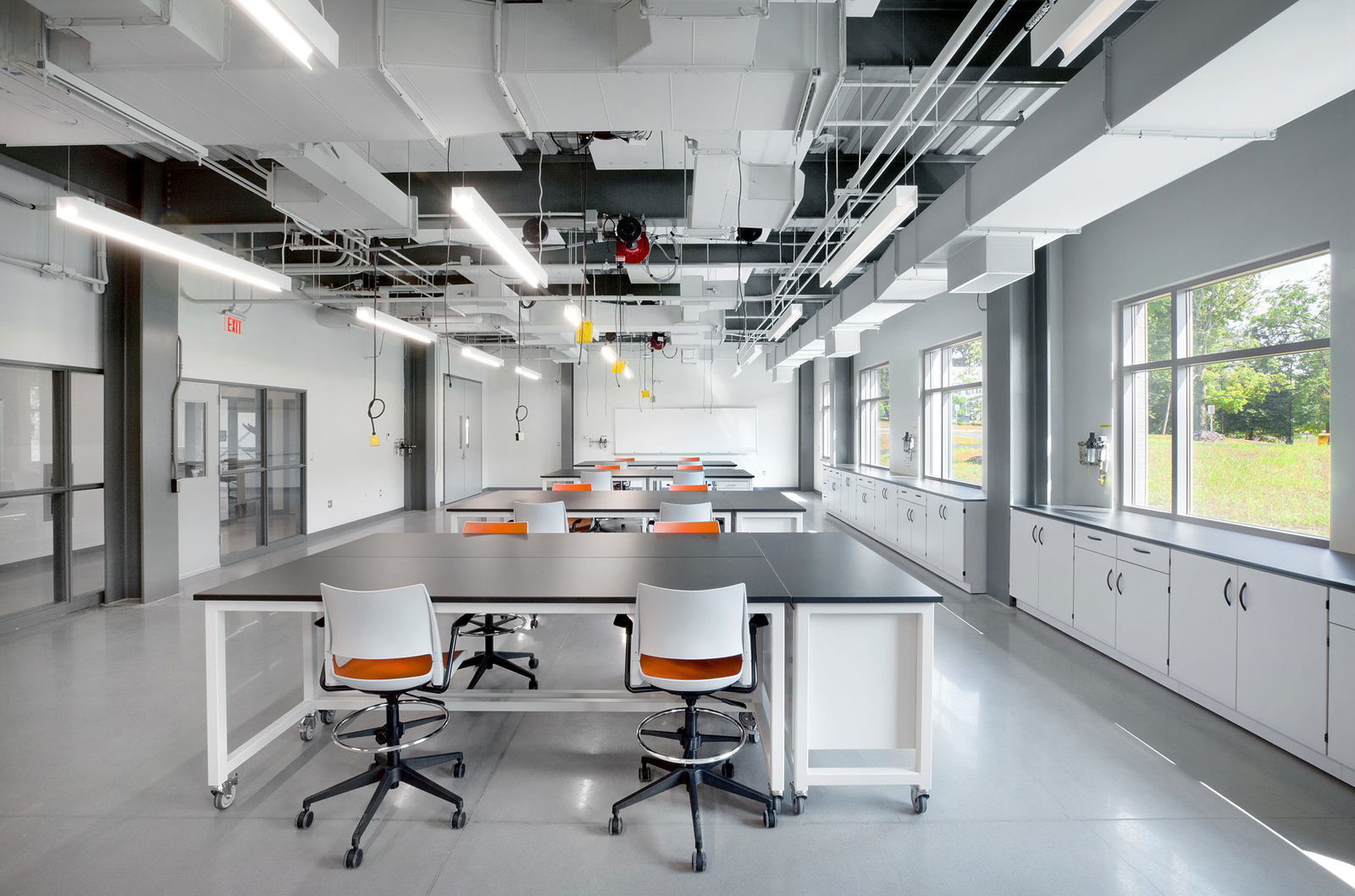 Flooring consists of polished concrete, carpet, vinyl composition tile (VCT), and glazed ceramic tile, all of which contains recycled content. The concrete mix used for flooring and foundations was locally sourced. Ceilings in the labs and the lecture room are fully exposed, reducing the need for standard acoustic tile systems. All materials were required to have low-VOC emissions.