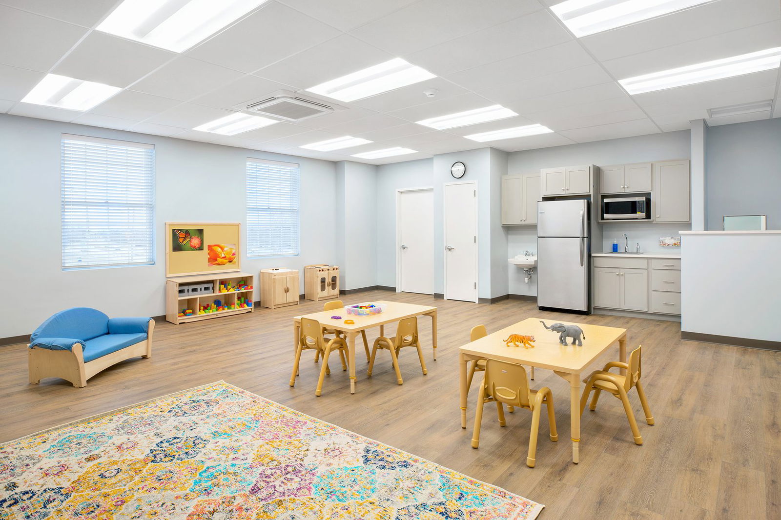 According to Florez, the ownership guided the team to create the design that felt very welcoming and home-like rather than institutional. “Parents enjoy the residential feel of the school’s original location. This is reflected in the new building’s color palette and choice of finishes, such soft, desaturated blues, greens, and greys, which provide a sense of color without overwhelming. The wood plank-look flooring serves the same design purpose,” she explained. The materials were also selected for their durability and ease of cleaning and maintenance.