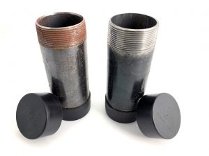 Pipe ends are sometimes capped to protect against physical damage and intrusion of foreign objects during storage and shipping. Cortec’s CorroLogic® CorrPlug® brings pipe caps to the next level by incorporating VpCI® corrosion protection technology directly into the plastic cover. CorroLogic® CorrPlug® pipe caps are heavy wall black polyethylene pipe caps containing proprietary Vapor phase Corrosion Inhibitors. CorroLogic® CorrPlug® pipe caps protect pipe threads, pipe ends, and other tubular objects from corrosion, mechanical damage, and contamination during transit, handling, and storage. The caps are specially designed for easy installation and removal and offer protection all the way to the last pipe thread. This helps eliminate extra labor on pipe ends that might otherwise need to be cleaned off before being joined together. During humidity testing, pipe threads capped with a CorroLogic® CorrPlug® showed a significant advantage in corrosion protection compared to pipes capped with regular plastic containing no corrosion inhibitors.