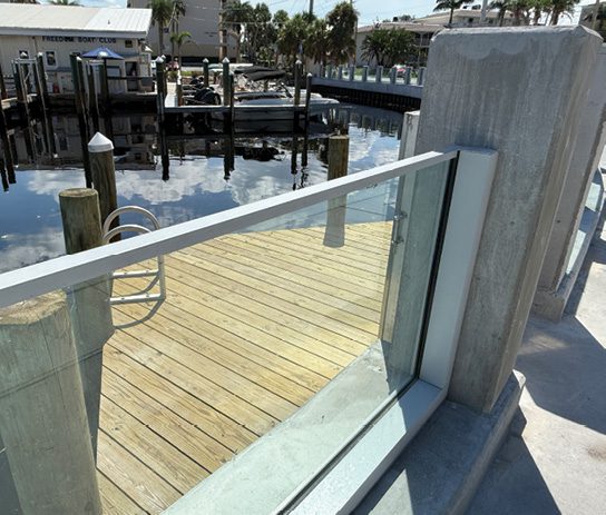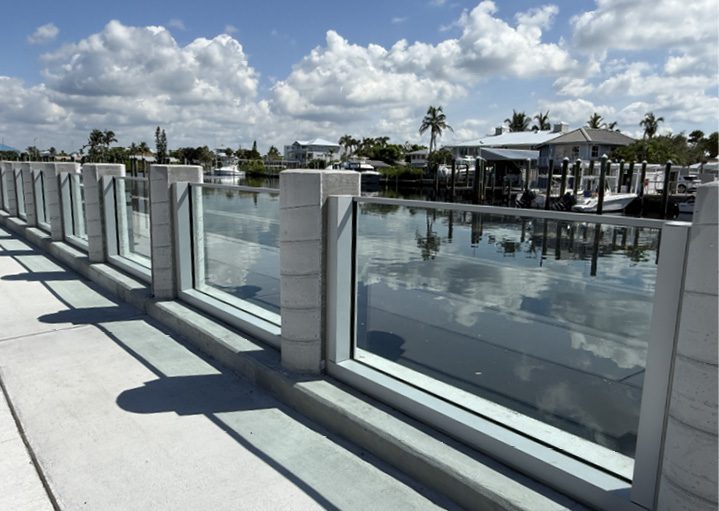 “For aesthetic reasons, if the top of the seawall cap isn’t level, the glass wall is usually installed on top of a concrete curb with a varying elevation, so the top of the glass wall remains level, which is much more appealing to the eye,” adds Kuzler.
