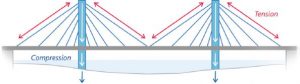 The Governor Mario M. Cuomo Bridge was designed and built to last more than a century without major structural repairs. The new bridge is a visually striking, recognizable landmark, and one of the widest cable-stayed structures of its kind in the world. Cable-stayed refers to a type of bridge where the deck is supported by straight cables attached to the top of towers. The towers are built first, and then deck sections and stays are attached progressively.