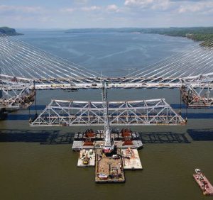 Following the first year-plus of construction, when most of the work was below the waterline, New Yorkers began seeing the new river crossing taking its iconic shape in 2015. With a growing number of workers and an armada of approximately 130 floating cranes, barges, tugboats and other vessels onsite, TZC completed the bridge foundations and an increasing procession of bridge piers across the Hudson River.