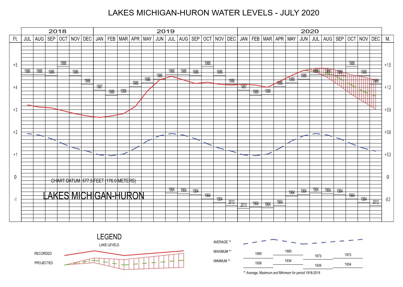 Figure 1 (above) shows Great Lakes water levels from 1918-2020. Figure 2 (below)shows the more-recent water levels continuing recent trends.