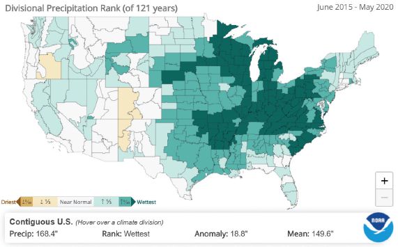 Alarmingly, the recent years from 2014 to 2020 have witnessed a steady rise in water levels across the basins, tying or breaking records set in the previous century of observation (see Figure 2). Correspondingly, as of May 2020, the wettest periods on record were recorded for the preceding 12-, 18-, 24-, 36-, 48- and 60-month periods in more than 120 years (see Figure 3). In that same time period, there have been six flooding events in the Great Lakes region that caused a billion dollars or more in damage, reaching a total of $7.1 billion.