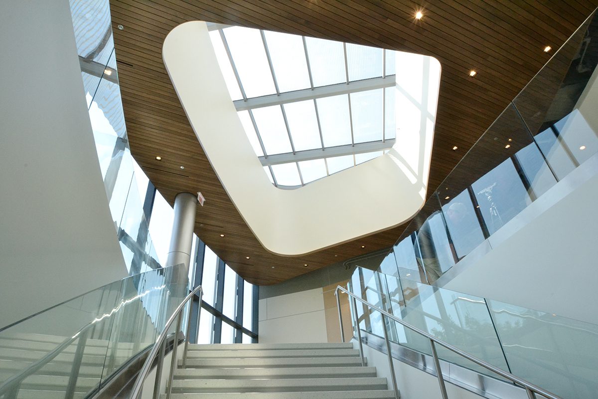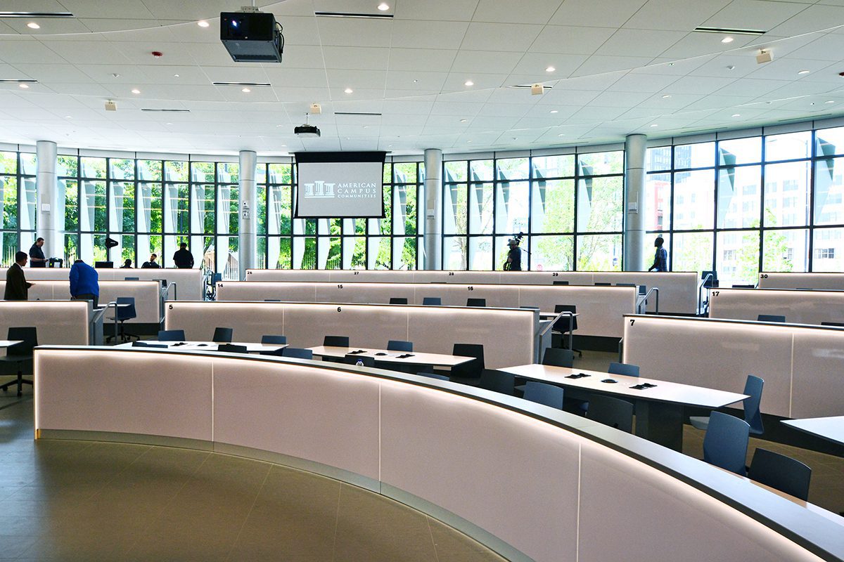 The residential tower’s structural system consists of concrete, two-way, post-tensioned flat slabs and reinforced concrete columns and shear walls, with staged stressed PT transfer beams. The classroom building features an oval floor plan with a steel braced-frame lateral system, long-span continuous plate girders with an 80-foot maximum span and a curved-steel feature stair spanning 45 feet. The structural systems of the two buildings are separated by an expansion joint. The complex is targeting LEED Gold certification.