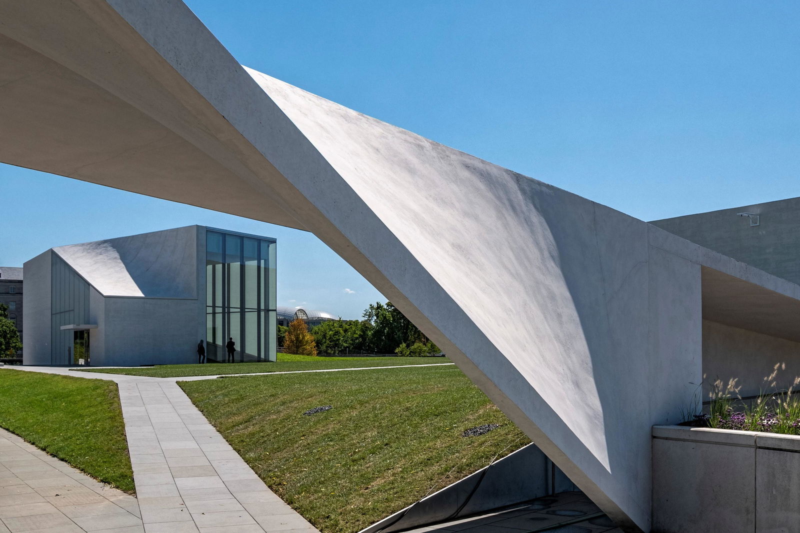 The Kennedy Center Expansion Project, known as the REACH, consists of three new buildings—the Welcome, Skylight, and River Pavilions—situated on the 4.6 acre (1.9 ha) campus along the Potomac River in Washington, DC. Each structure features titanium-white board-formed concrete, sweeping curves, and crisp clean lines that complement the existing monument.