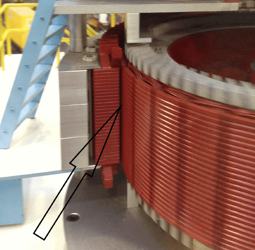 Figure 1 is a cut-away view of a representative generator model. The arrow points to the air gap between the rectangular stator winding on the left, and the rotor on the right. This gap is typically measured at individual poles from above and again from the underside.