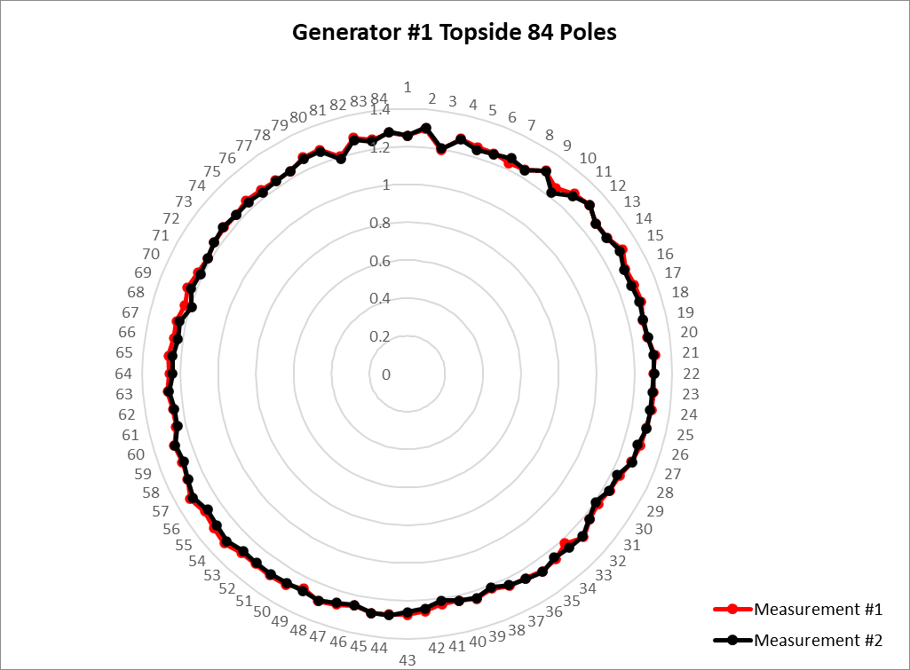 At this same facility, the operator quickly downloaded data from the app into an Excel spreadsheet and generated the radar plot shown in figure 5. The data is displayed with the actual pole number. Two sets of data were taken by two different operators to verify repeatability of the measurements. As can be readily seen, results are consistent. A quick review of the data can reveal inconsistencies or potential problem locations that should be verified.