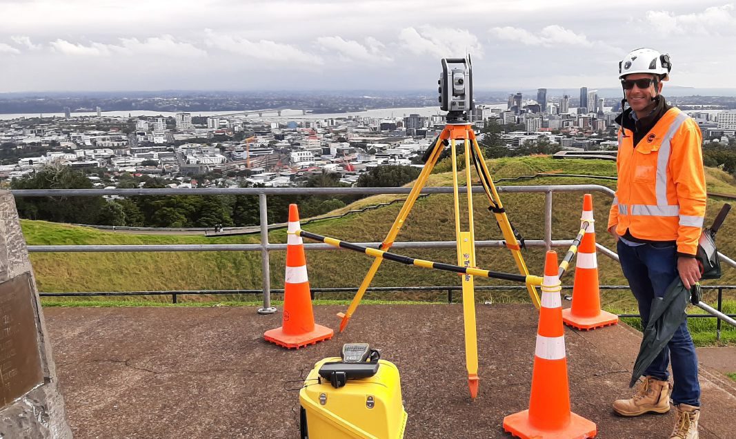 Setting up on the summit of Mt. Eden 4 kilometers south of the CBD, Williams used Trimble R10 GNSS receivers to verify the Land Information New Zealand (LINZ) continuously operating reference station (CORS) at the port of Auckland and established that as his base station. He then carried out static GNSS observations on three existing LINZ datums and verified those accuracies.