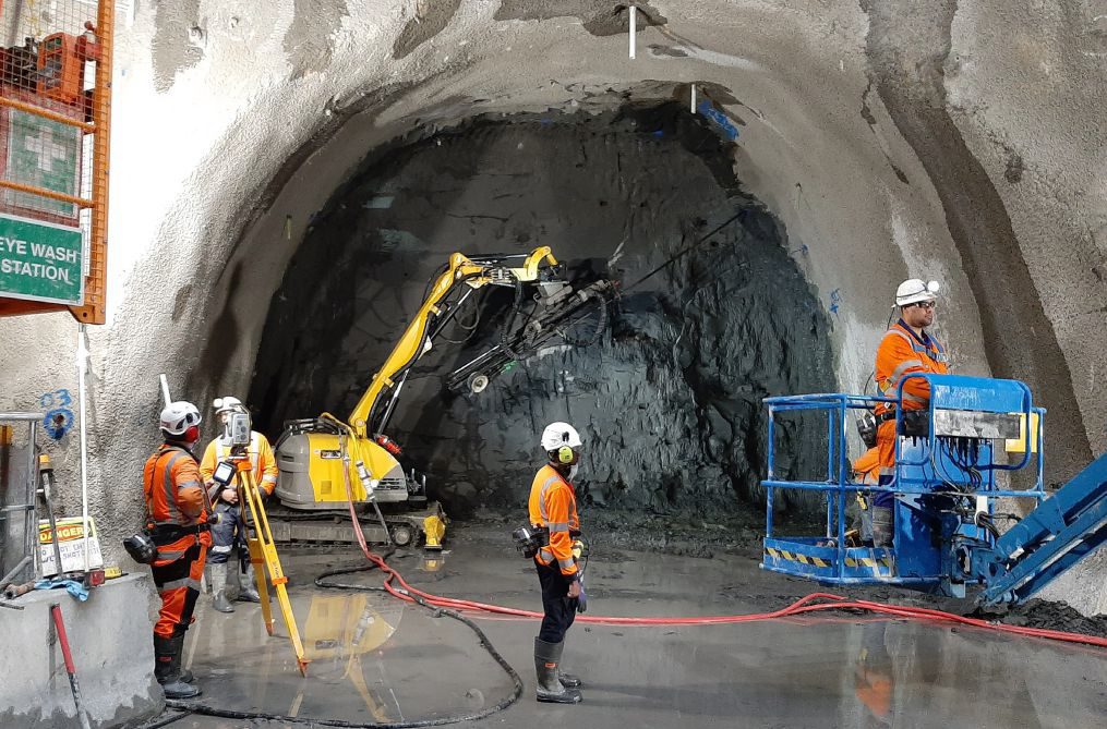 For the Karangahape station tunnels, teams sunk a 25-meter-diameter shaft 25 meters deep and then tunneled 20 meters east and west to provide launch points for excavating the station’s 278-meter-long rail tunnels that include 203-meter-long platforms. As the two excavators and road header advance, survey teams use the SX12 to guide the excavation, set out rock bolts and confirm shotcrete layers.