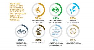 - Increased mobility for non-drivers cited as most important benefit of autonomous vehicles by 52 percent of respondents