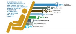 The HNTB survey also asked Americans what they would do while riding in an autonomous vehicle instead of driving themselves. Two-thirds of respondents (66 percent) believe they will most likely spend their time looking out the windows of their vehicles. Texting or talking is the next more likely activity according to 42 percent of respondents, followed by watching movies or playing games, 29 percent. Twenty-five percent believe they will sleep. Only 17 percent of respondents said they would work.