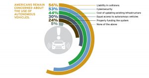 Additionally, liability in the event of a collision was identified by 56 percent of respondents as the single greatest concern associated with the implementation of autonomous vehicles, followed by cybersecurity/potential to hack the vehicles (53 percent). The cost of updating existing infrastructure to safely support autonomous vehicles was noted by 44 percent of respondents.