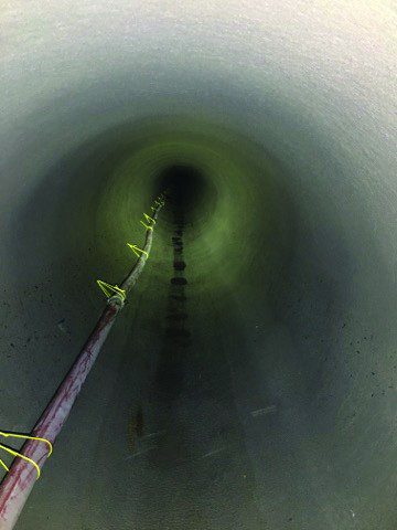 Before any lining was placed, technicians removed all loose scaling materials and slime layers. Cleaning prepared the surface for the geopolymer and uncovered any problem areas such as crack voids and active infiltration that would need to be addressed. After cleaning and grouting were performed, the team placed depth-gauge markers throughout the sewer to help confirm liner thickness. Concrete screws were set to a depth of 2.25 inches to accommodate the screw head being covered with a 2.5-inch-thick lining. (It’s also possible to estimate the average thickness of the lining based on the amount of material applied over a given area.)
