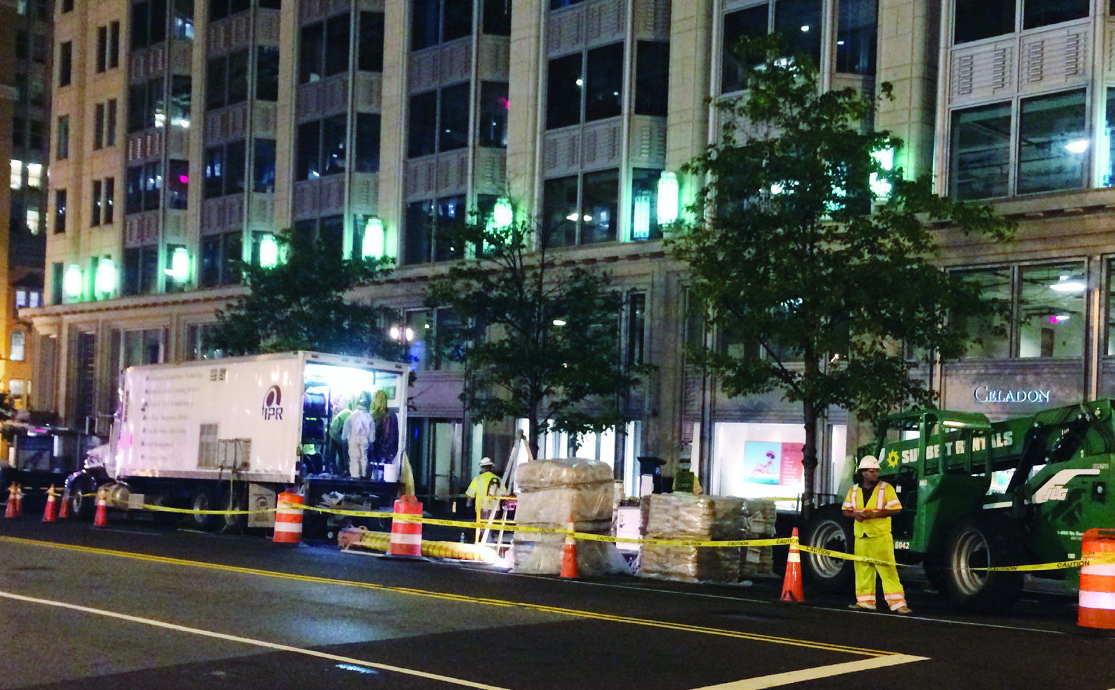 F Street has a parking lane on both sides and two lanes of traffic in each direction with manhole access in the center of the right traffic lane. Parking was prohibited as was traffic in the right travel lane during construction, which was scheduled to take place between 7 p.m. and 5 a.m. Monday through Friday. The project footprint was designed to accommodate the following: