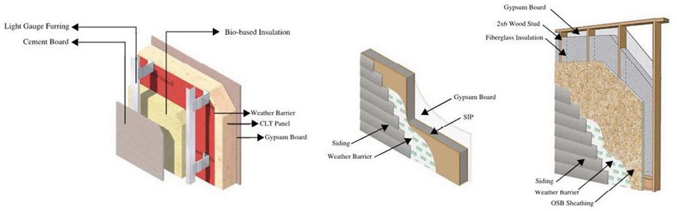 The research described in this article focuses on evaluating the lifecycle assessment (LCA), hygrothermal performance (i.e., of or relating to a combination of moisture and heat) using WUFI simulations, and thermal resilience of three distinct residential building envelope systems: 1) a conventional stick-built system with continuous insulation, 2) structural insulated panels (SIPs) and 3) a bio-based cross-laminated timber (CLT) system. These systems were selected based on their common applicability to the climate conditions and the sustainability demand of the materials.