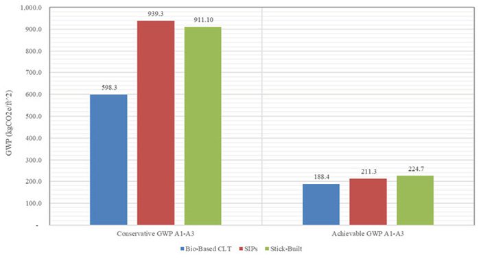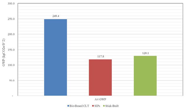 The bio-based CLT system demonstrated the lowest GWP compared to SIPs and the conventional stick-built system, highlighting the environmental benefits of using CLT, which supports carbon sequestration. The SIPs and conventional stick-built systems showed similar GWP values, indicating that both systems have room for improvement in terms of reducing their carbon footprints. The transportation impacts (stage A4) were also analyzed, with the SIPs system showing the lowest transportation-related GWP due to its lighter weight and efficient logistics.