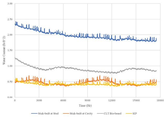 Stick-built system:The stick-built system at stud demonstrated a moderate water-loss rate of 8.15 percent, indicating a relatively stable performance through two years. However, the stick-built system at the cavity, which utilized fiberglass insulation, exhibited an unusual increase in moisture content, resulting in a negative water loss rate of -8.08 percent. This suggests potential issues with moisture ingress or inadequate drying.