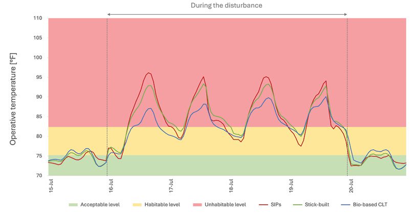 Overall, the bio-based CLT system provided the highest thermal resilience, maintaining lower indoor temperatures for a longer period during the blackout. This highlights the significance of incorporating thermal mass alongside insulation when designing buildings for extreme climate resilience. The findings support mass-timber construction as a viable passive design strategy to enhance occupant thermal comfort and reduce heat stress risks during power failures in hot conditions.