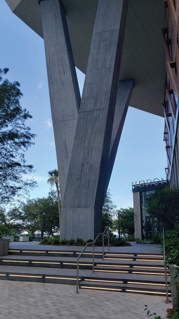 This building, which sits at the entrance to the Tampa Riverwalk, is both to see and be seen. It offers a prime vantage point and is, itself, visually striking. The waterfront location offers desirable water or downtown views, made even more accessible by the floor-to-ceiling windows and spacious balconies that encourage outdoor living and entertaining. Common element green roof gardens and rooftop pools enhance the livability of city life. It’s part of Water Street Tampa, a mixed-use neighborhood on 56 acres of waterfront property that promotes itself as walkable, sustainable and connected. PLC concrete fits perfectly with these design goals by offering similar performance as ordinary portland cement concrete with increased sustainability.