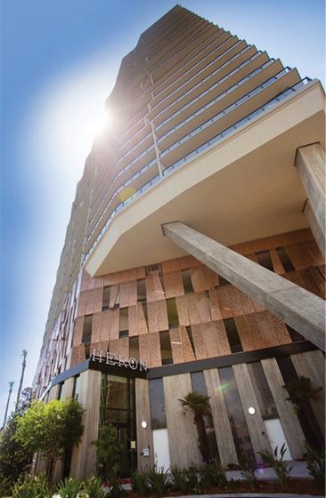 Concrete strength levels have gradually increased during the last few decades. In 1992, the American Concrete Institute Committee on High-Strength Concrete (ACI 363) recognized 6,000 psi as high strength. By 2001, the committee increased that to 8,000 psi or greater. By the ACI definition, Virage’s structural system is built using high-strength concrete: The post-tensioned slabs are made with 8,000 psi concrete and the shear walls and columns are 10,000 psi. Except for the precast members, PLC and SCMs were used for most of the concrete mix designs.