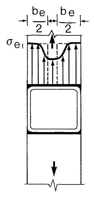 If connecting a plate (or beam flange) transverse to an HSS, or an HSS branch to a rectangular HSS member, AISC 360-16, Section K1.2a requires a reduced width (“effective width”) be used when calculating the local yielding of the connected plate or branch member. This is because the transverse plate or HSS is not uniformly loaded across its width (see Figure 1). Due to the relatively high stiffness of the HSS wall adjacent to the sidewalls, the stress in the plate or branch member is highest at the outer portions of the section and lowest in the middle. Due to this effective width, it’s rarely possible to achieve a connection capacity equal to the full yield strength of the member being connected to an HSS and, therefore, often eliminates the need for a full capacity weld.