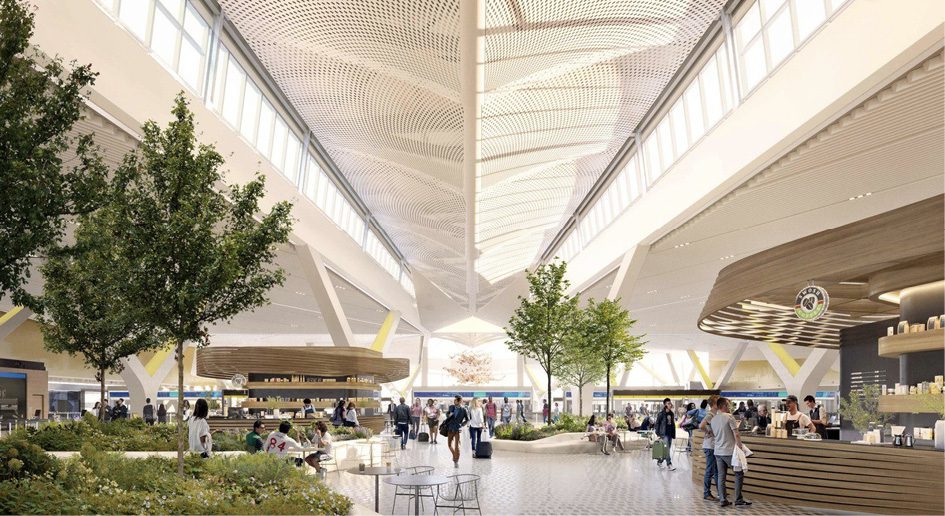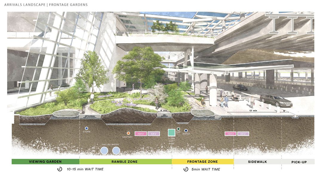 NTO will welcome visitors approaching the arrivals curb with a 3.5-acre park before they reach the building’s ETFE high-performance plastic canopy and glazed façade. The 115-foot setback between the building and the roadway, originally established for security reasons and to accommodate the primary utility corridor, evolved during the design process beyond a simple buffer into a “welcoming landscape experience at the terminal’s front door,” explains Samantha Partington, project manager at OJB, which provided landscape architecture services for the project.