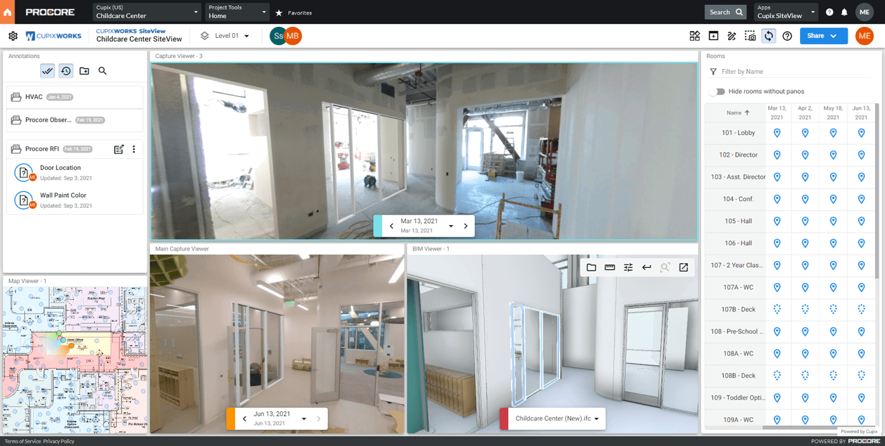 Cupix’s real-time 3D digital twin collaboration tool, SiteView, offers life-like virtual remote site navigation, progress tracking, as-built vs. BIM analysis, 3D measurements, and 3D annotations. Since Cupix’s SiteView virtual representation of a job site can be embedded in the Procore platform, users can remotely “walk through” a job site, navigating to the location of RFIs, observations and open items, and searching by location names. Additionally, users are able to review job sites retrospectively, enabling teams to review iterative progress on a job site dating back days, weeks or months.