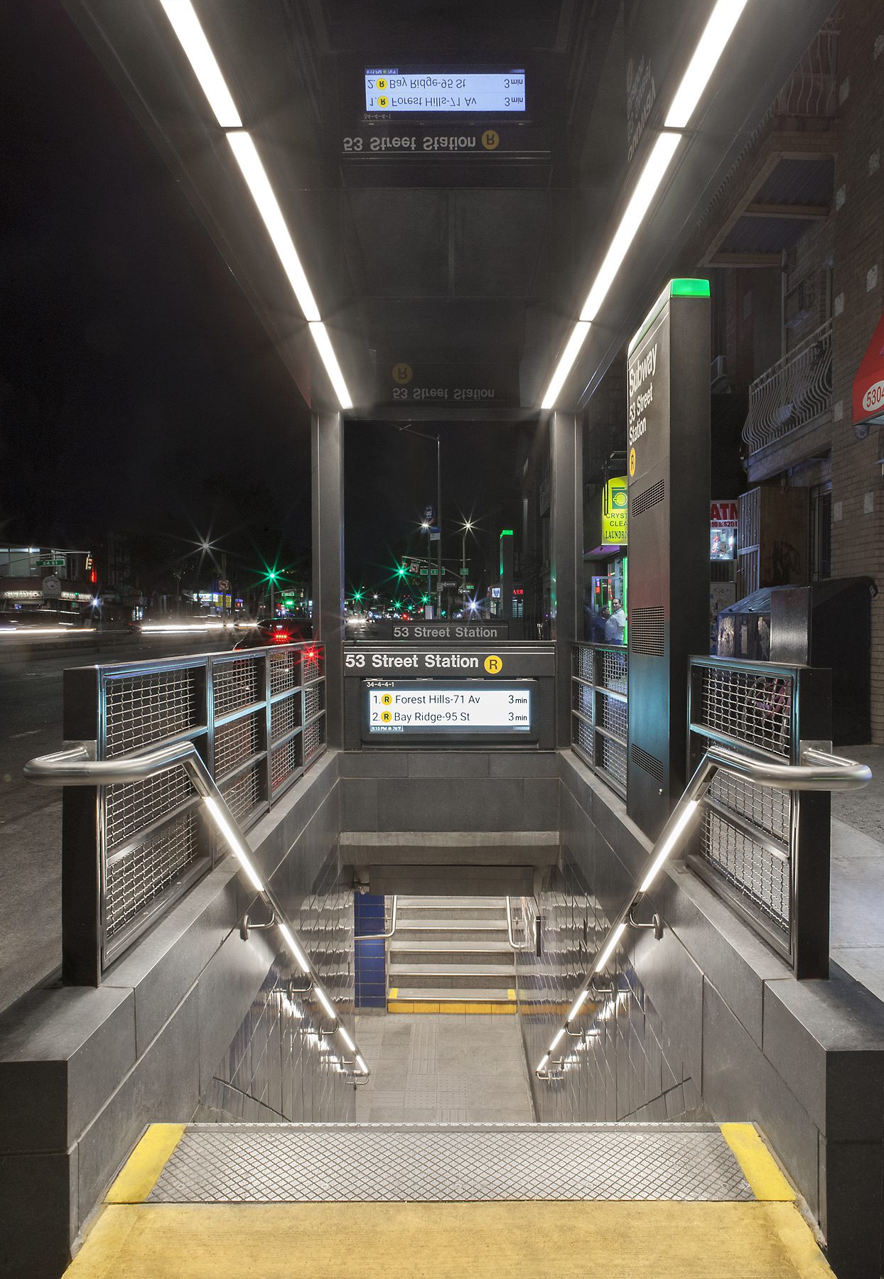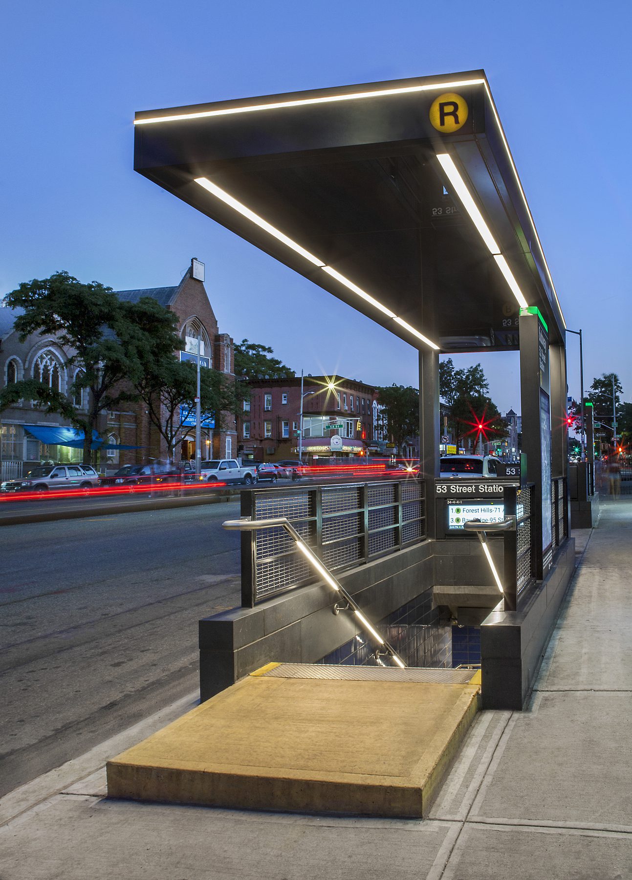 Shaped like an inverted letter “L,” the roofs extend over the entire stair openings, with the glass portion of the roof illuminated by a band of LED lights. Each canopy sports new MTA signage consisting of an LED-backlit translucent plastic sign that says “Subway” as well as a route designator of a yellow circle with a black letter “R.” Together, the canopies and new signage handsomely proclaim the station’s presence at the street level.
