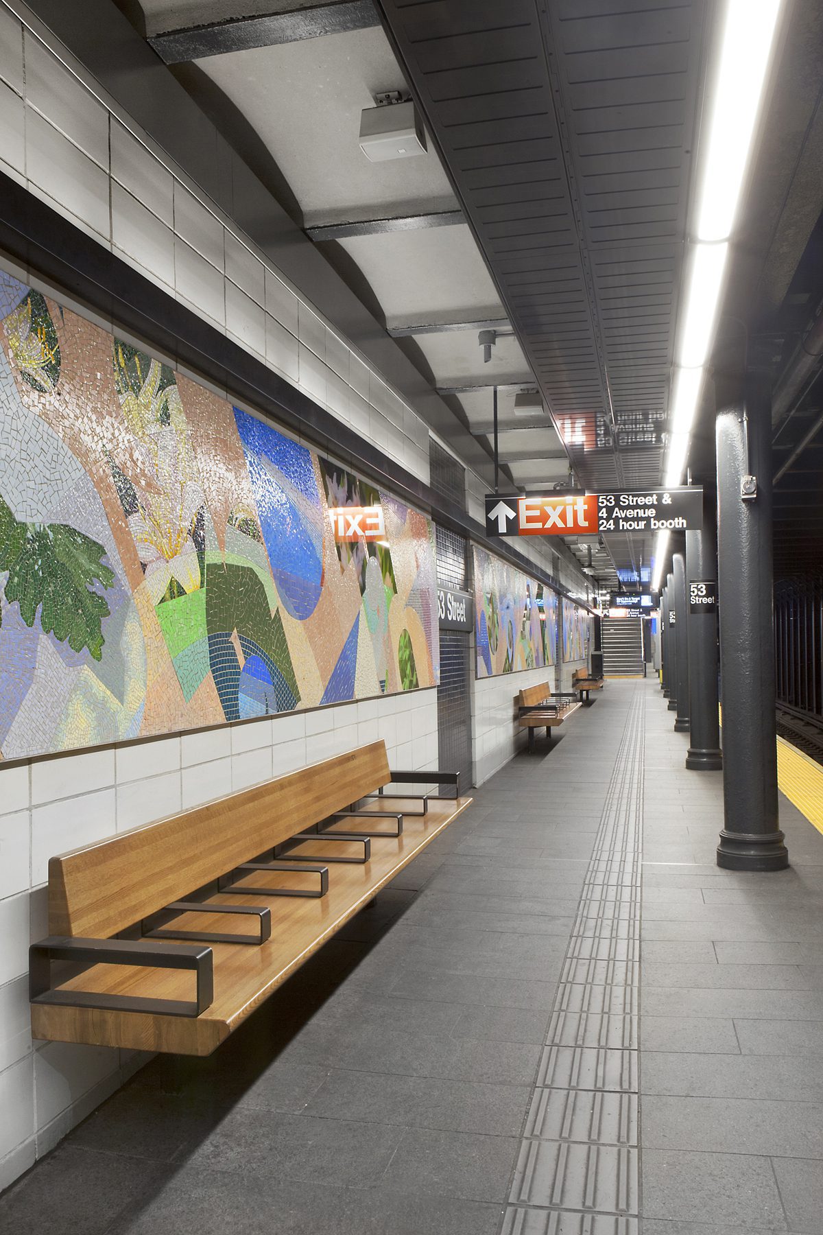 Urbahn found that the 53rd Street station was of two eras: several original elements of the circa-1915 station were still extant, such as some of the tile work. Other elements were holdovers from work done in the late 1970s, when the platforms were extended to current dimensions and selective upgrades were performed, including work on the staircases. Cinderblock tiles (gray with yellow indentation) replaced some of the original wall tile; signage was modernized with black-and-white lettering; and unattractive, utilitarian linear fluorescent fixtures replaced the original incandescent lights.