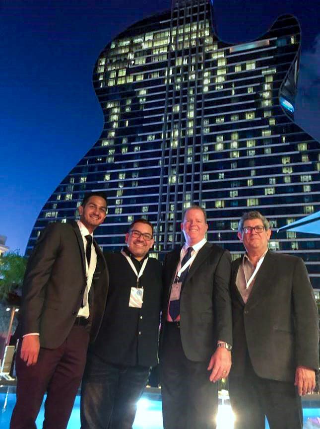 1. The DeSimone project team at the Seminole Hard Rock Hollywood Hotel & Casino grand opening on October 24th. From left to right: Ryan Goolabsingh, Luis Ramirez, William O’Donnell, and Ramiro Areas (Credit: DeSimone Consulting Engineers)