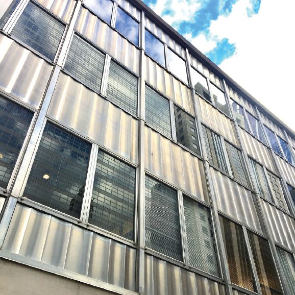 Stainless-steel panels originally part of the Morton Salt Headquarters (top) were installed at the lower level of the new building (bottom).Goettsch Partners