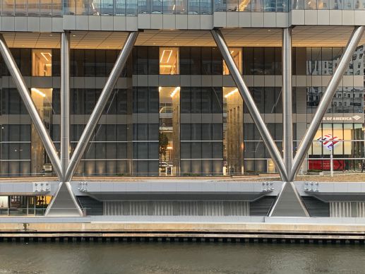 To provide an open, unobstructed area between the building and the river at ground level, the load-bearing columns from the upper floors were transferred to the foundation with three massive tridents. As with many aspects of this project, the trident solution to the open-space challenge resulted in additional benefits. Namely, fewer columns along the river meant less chances for conflicts between the proposed foundation and the existing subsurface river-wall battered piles and rakers.