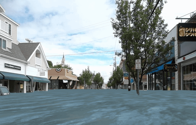 A 3-D visualization can help citizens understand the impact of sea-level rise, as projected on this business district with a street-level view. Image courtesy of Kleinfelder.