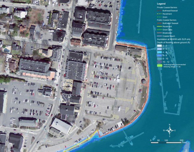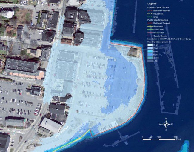 Here the same inner harbor of Scituate, Mass., is shown with resulting flooding from a Category 1 Hurricane. Detailed models of climate-change effects help local planners make better decisions.