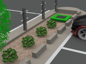 The main parking lot has two biofiltration systems. The one on the north side featuring the rounded modules was manufactured and installed first. The main run is nearly three feet wide and just more than 600 feet long, mostly basic curb-cut units without pre-filtration. The modules that lie perpendicular to the main run are seven feet wide. They divide the parking lot into six Drainage Management Areas (DMAs), each about 100 feet long for managing about 10,000 square feet of surface runoff.