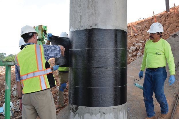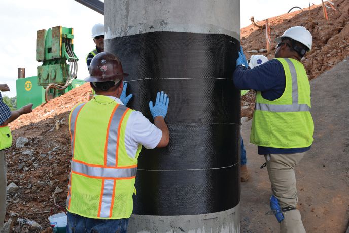The RenewWrap system consists of high-strength carbon-fiber fabrics that are coated in the field with epoxy resins and bonded to or—in the case of the column repairs—wrapped around the structure to strengthen the member being repaired.
