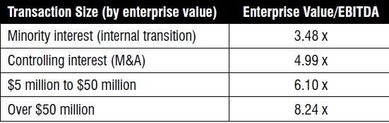 Table 1 illustrates overall enterprise values as a multiple of earnings before interest, taxes, depreciation and amortization (EBITDA) in 2021. The “minority interest valuation multiples” reflect enterprise values (i.e., the value of a company on a debt-free, cash-free basis) of firms that have traded minority (non-controlling) ownership stakes, typically as part of an internal ownership transition or non-controlling ESOP transaction. The “controlling interest EBITDA multiples” reflect the enterprise values of firms that have been acquired by—or merged with—another firm.