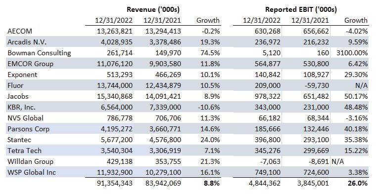 Data from the SEC filings of publicly traded companies in the A/E industry confirm the anecdotal observations. Analyzing the 2022 calendar year-end data from 14 publicly traded firms shows an average increase in revenue of 8.8 percent (weighted by dollar volume). And despite upward pressure on wages and the impact of inflation on other expenses, earnings increased at an even higher rate of 26.0 percent during the same period.