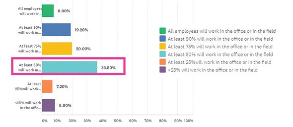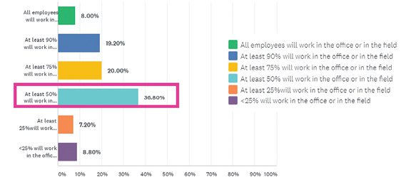I anticipate the new workplace to be a blend of those who return to the office full time (again, many already have), those who prefer to work remote, and the majority preferring a blended work week between home and office. The office of the past was where “work” got done. The office of the future will be where “culture” gets done. See the below graph of a recent poll I conducted of A&E HR directors asking what they envision will be the new workplace norm post pandemic: