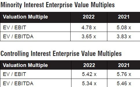 This year’s survey included 241 transactions, including internal minority interest ownership transition transactions and controlling interest merger and acquisition (M&A) transactions. The tables below illustrate the enterprise values of the surveyed firms as a multiple of earnings before interest and taxes (EBIT) and earnings before interest, taxes, depreciation and amortization (EBITDA).