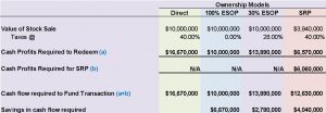 In the example, the company’s book value is $3.94 million, its fair market value is $10 million, and the assumed tax rate is 40 percent. We have compared the economic benefit of redeeming $10 million of value using a direct ownership model, a 100 percent ESOP ownership model, a 30 percent ESOP ownership model, and a Supplemental Retirement Plan (SRP) model, which uses common and synthetic equity.