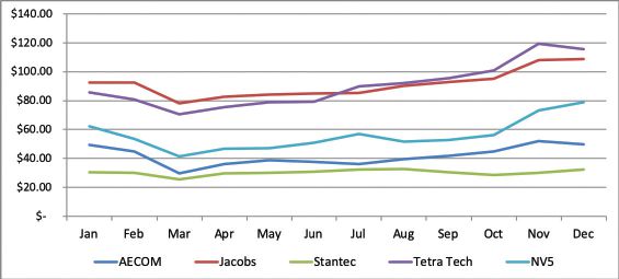 The most commonly cited negative trend has been a decline in contract backlog and concern over the limited opportunities to network and conduct typical business-development activities (due to COVID precautions) to replace that backlog. Similarly, although individual productivity may not have suffered, team collaboration is more difficult, and there are fewer opportunities to train and mentor junior staff. These and other factors could impair growth and financial performance in 2021 and beyond. However, the stock performance of the publicly traded firms offers some encouraging insight into the near-term outlook.