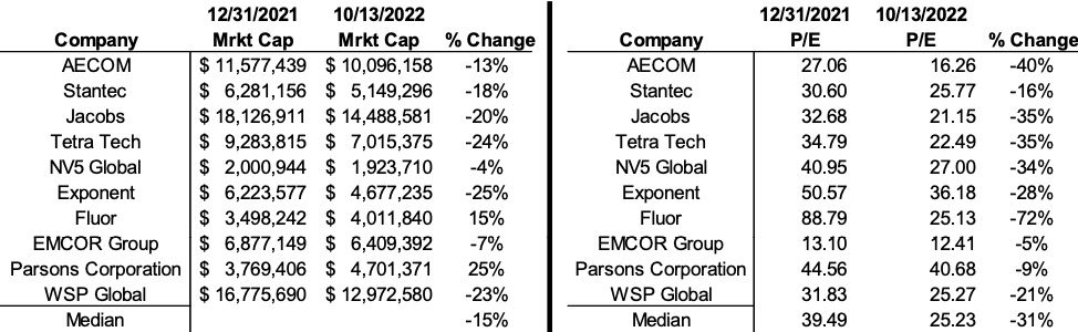 As the accompanying chart indicates, the median PE ratios of A/E firms are down 36 percent, much higher than the median decline in market capitalization. P/E multiples falling further than market capitalizations indicate that, as with the broader indices, earnings among the publicly traded A/E firms are up for the year.