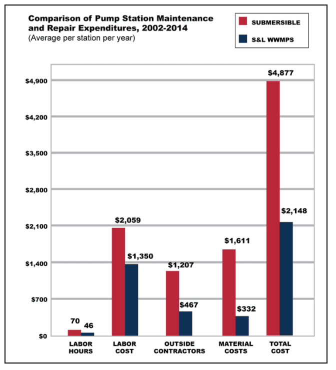 One example comparing maintenance and repair costs of above-ground well-mounted pump stations versus submersible pumps is a comprehensive 12-year side-by-side study conducted for the Unified Government of Wyandotte County and Kansas City, Kansas. The published study [1] demonstrated the life-cycle cost advantages of above-ground lift stations compared to their submersible pump counterparts. Utilizing asset management software, the study scrupulously recorded all maintenance and repair expenses for 53 duplex pump stations within Wyandotte County’s wastewater collection system. This study measured and compared labor hours and costs, outside contractor expense, parts costs and total expenditures for these stations over the 12-year period.