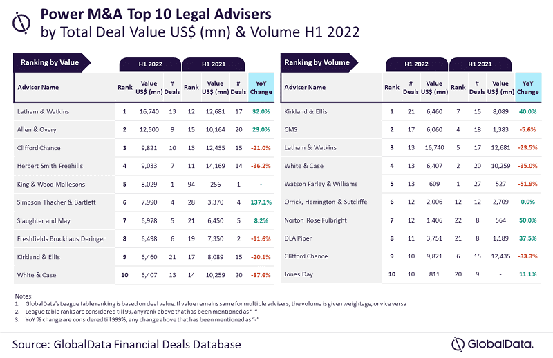 Latham & Watkins and Kirkland & Ellis top M&A legal advisers by value and volume in power sector for H1 2022, finds GlobalData