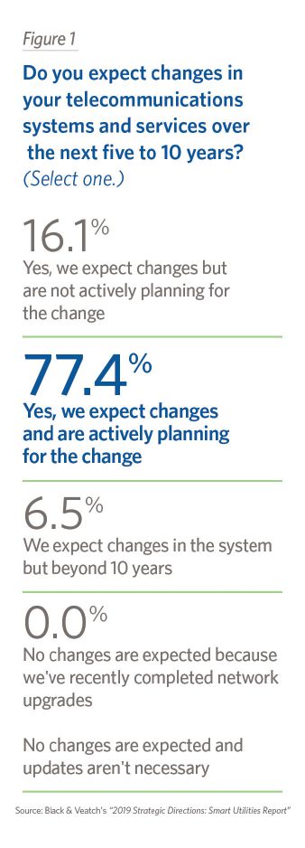 Nearly eight of every 10 respondents to the survey for Black & Veatch’s recent “2019 Strategic Directions: Smart Utilities Report” (pages.bv.com/SDR-SmartUtilities-Download.html) said they expect their telecommunications programs to grow over the next five years to a decade and are actively planning for that shift. An additional 16 percent anticipate change but haven’t begun planning.