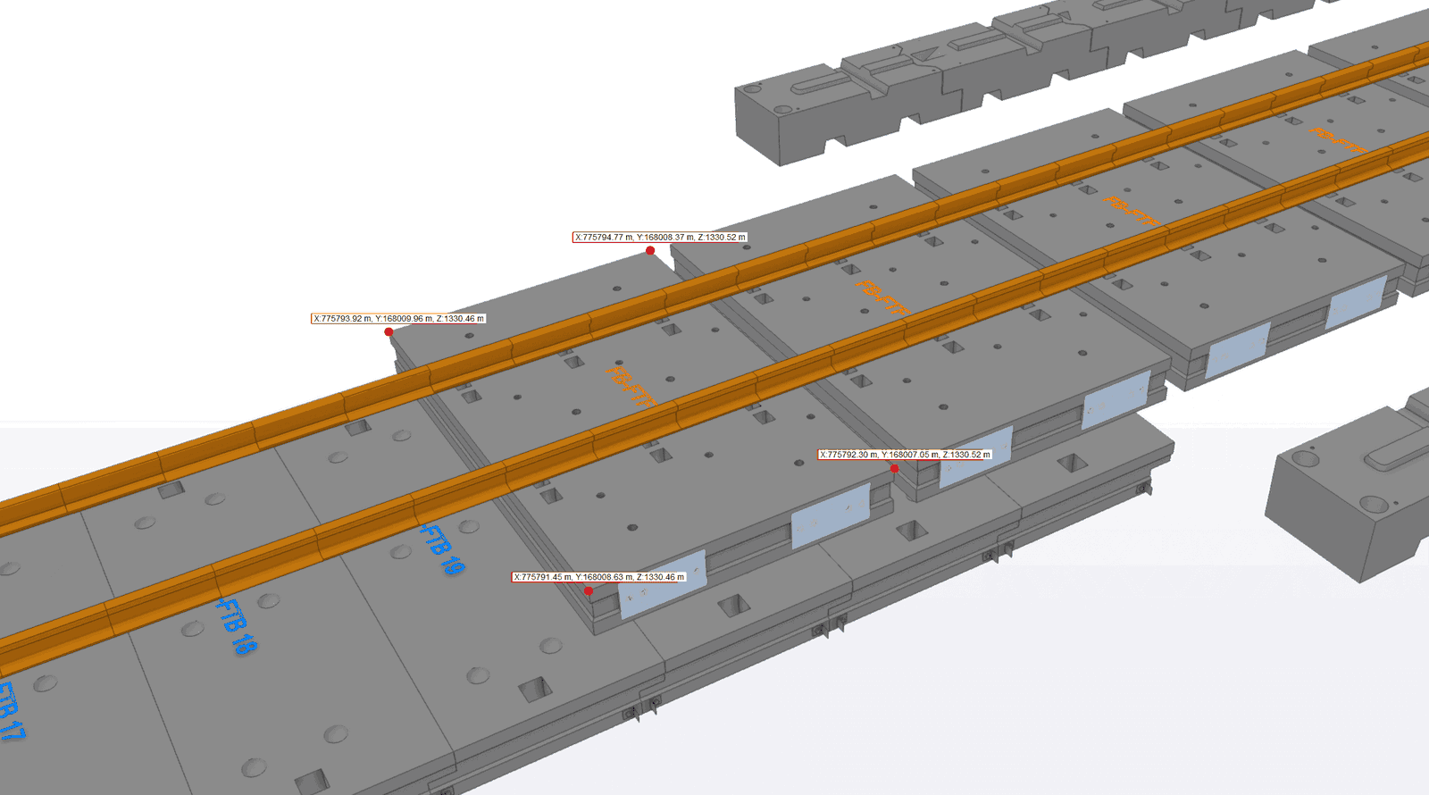 Set-out points for the concrete precast elements of the railway were exported from the BIM model and used as an overlay in Trimble Access to view on the Trimble T10 tablet. All graphics: Credit Donatsch + Partner AG.